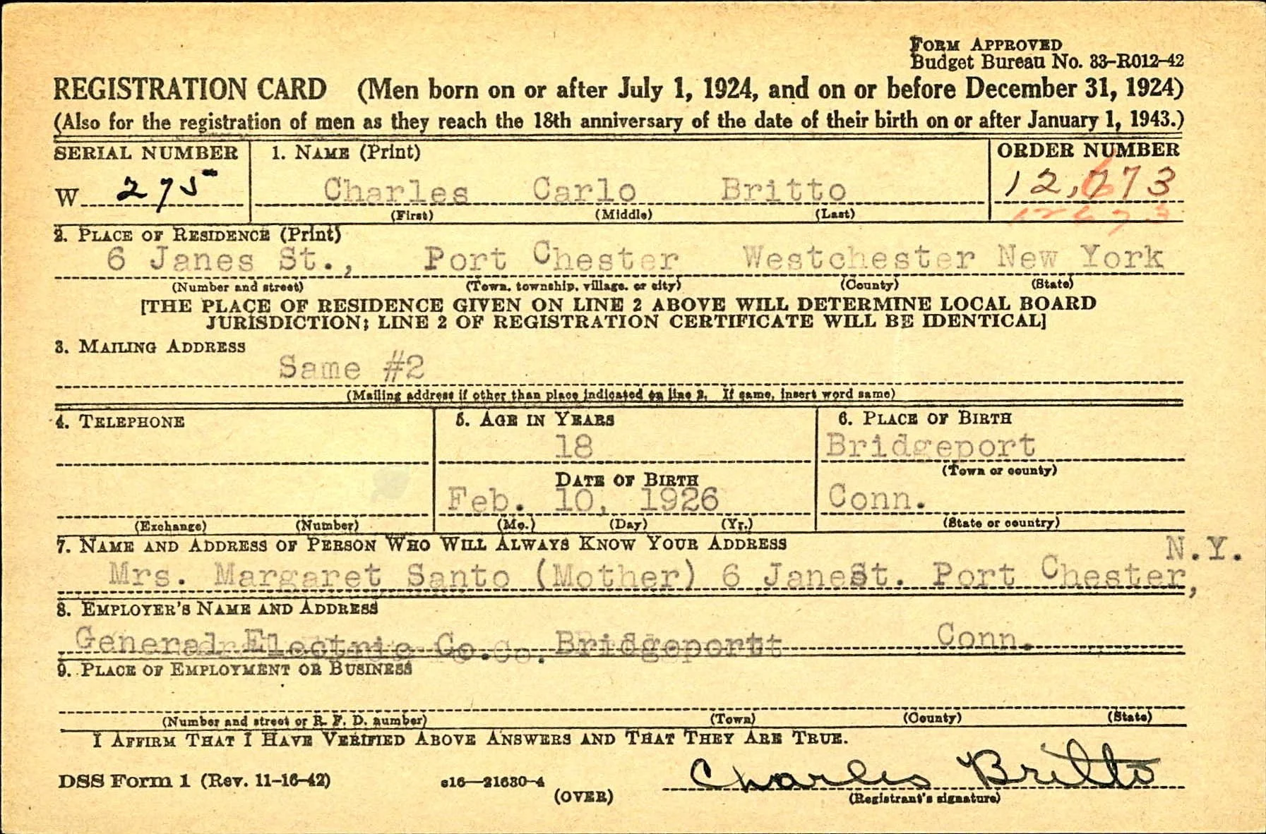 Charles Carlo Britto’s draft card during World War II. He is 18 years old, born in Bridgeport, Connecticut and he lives at 6 Janes St., Port Chester, New York with his mother, Margarita Martina Neves Britto Santos.
